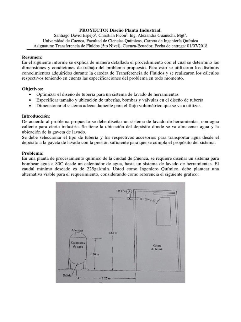 Asignatura: Transferencia de Fluidos (5to Nivel), Cuenca-Ecuador, Fecha de entrega: 01/07/2018