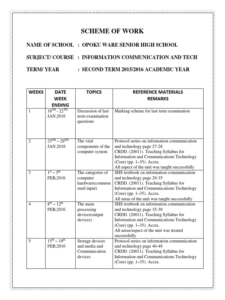 May, 2016 WEEK Information and Communications Technology VACATION (Core) (pp. 1–35). Accra. WEEK All areas/aspect of the unit was treated successfully