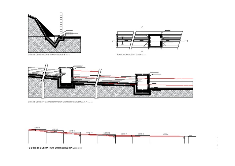 CORTE ESQUEMATICO LONGUITUDINAL ESC:1.150 DETALLE CUNETA Y CAJAS DE REVISION CORTE LONGUITUDINAL A-A`