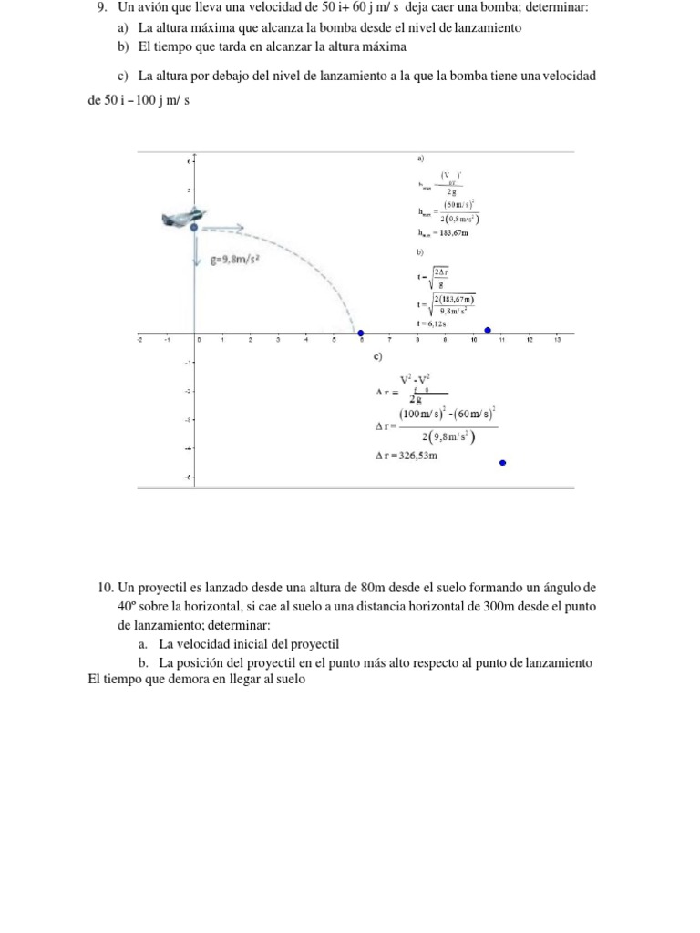 Un avión que lleva una velocidad de 50 i+ 60 j m/ s deja caer una bomba; determinar:
