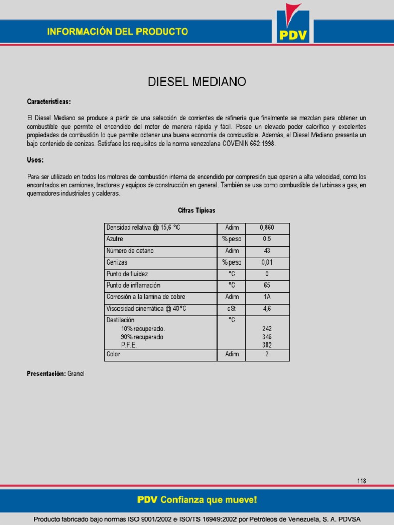 propiedades de combustión lo que permite obtener una buena economía de combustible. Además, el Diesel Mediano presenta un