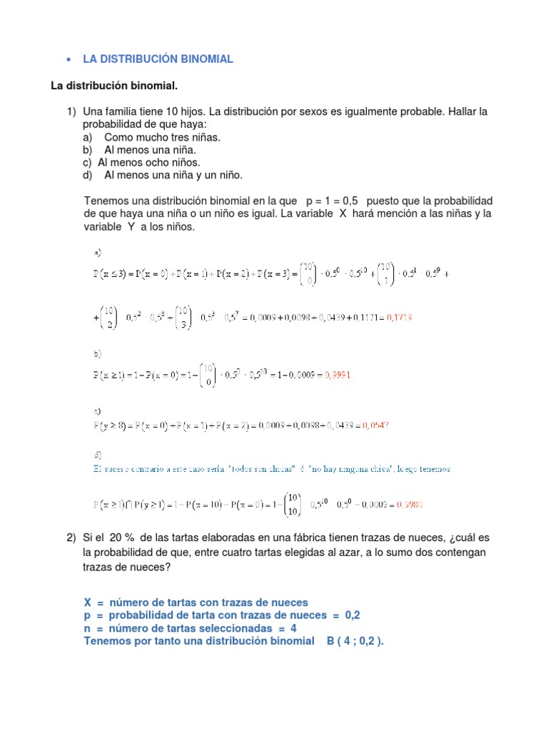 1) Una familia tiene 10 hijos. La distribución por sexos es igualmente probable. Hallar la