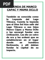 Capac y Mama Ocllo, recogida por el cronista inca Garcilazo de la Vega; y la segunda