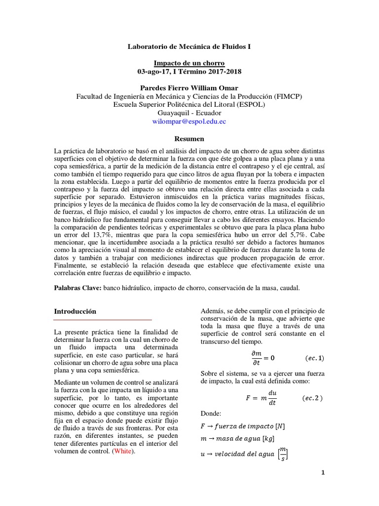 Palabras Clave: banco hidráulico, impacto de chorro, conservación de la masa, caudal.