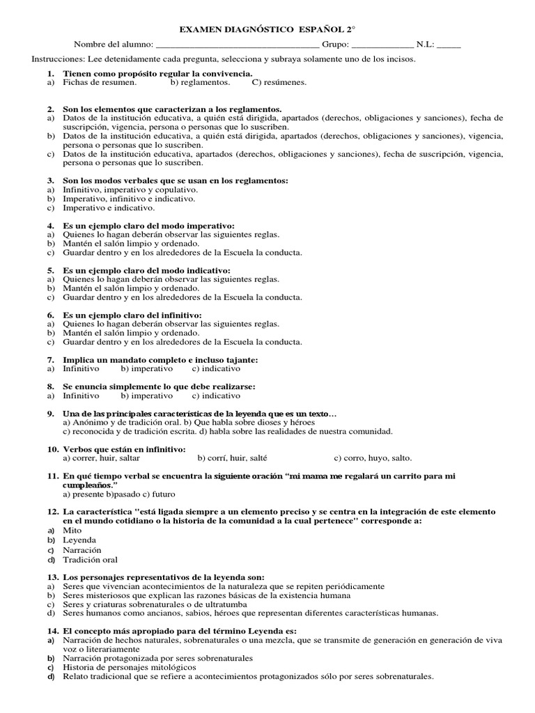 EXAMEN DIAGNÓSTICO ESPAÑOL 2°