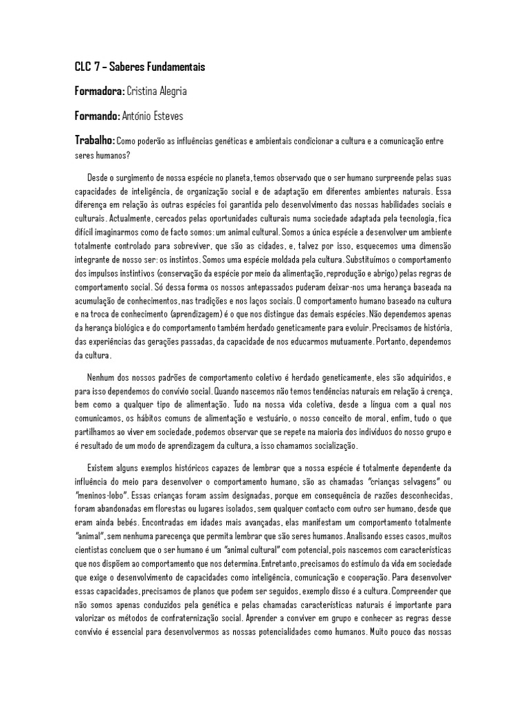 Trabalho: Como poderão as influências genéticas e ambientais condicionar a cultura e a comunicação entre