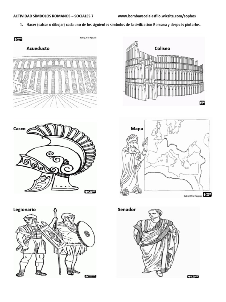 1. Hacer (calcar o dibujar) cada uno de los siguientes símbolos de la civilización Romana y después pintarlos.