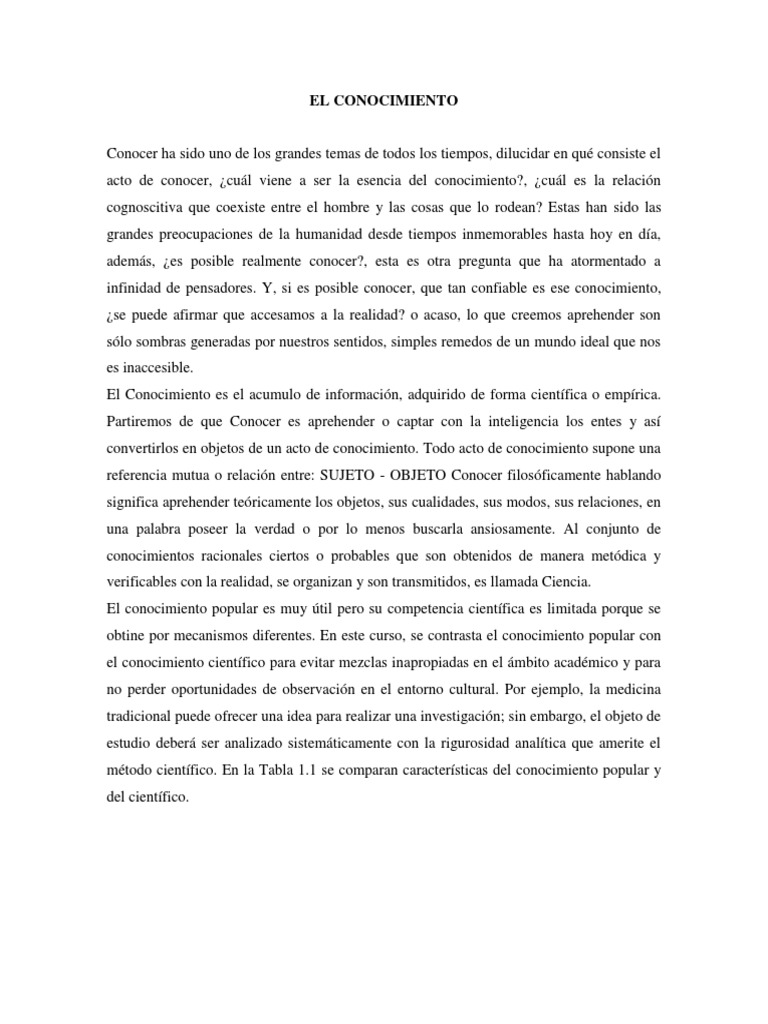 método científico. En la Tabla 1.1 se comparan características del conocimiento popular y