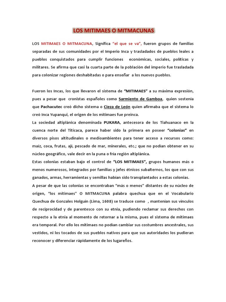origen, “los mitimaes" O MITMACUNA palabra quechua que en el Vocabulario