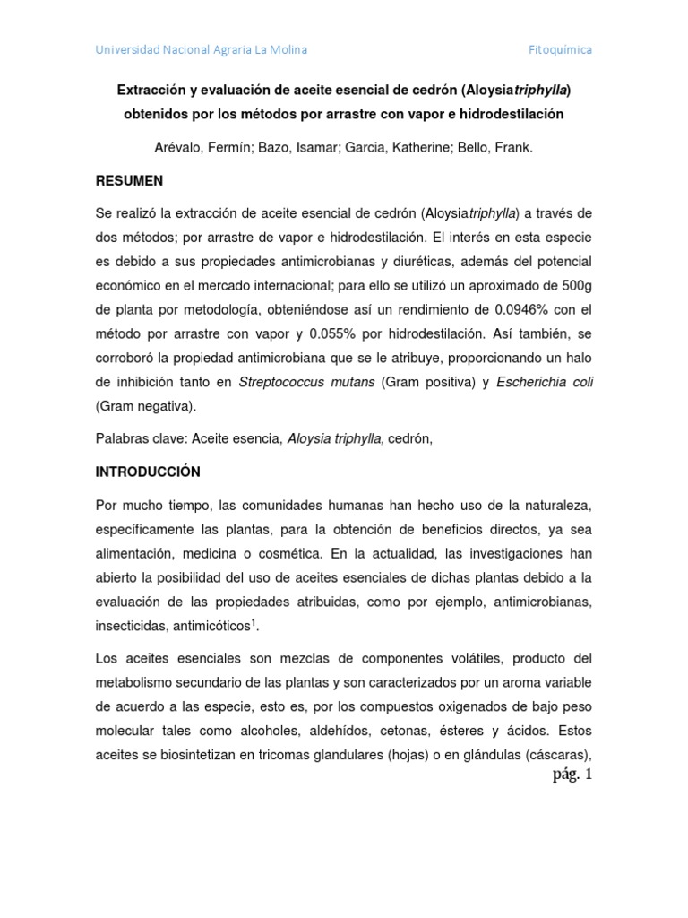 Extracción y evaluación de aceite esencial de cedrón (Aloysiatriphylla)