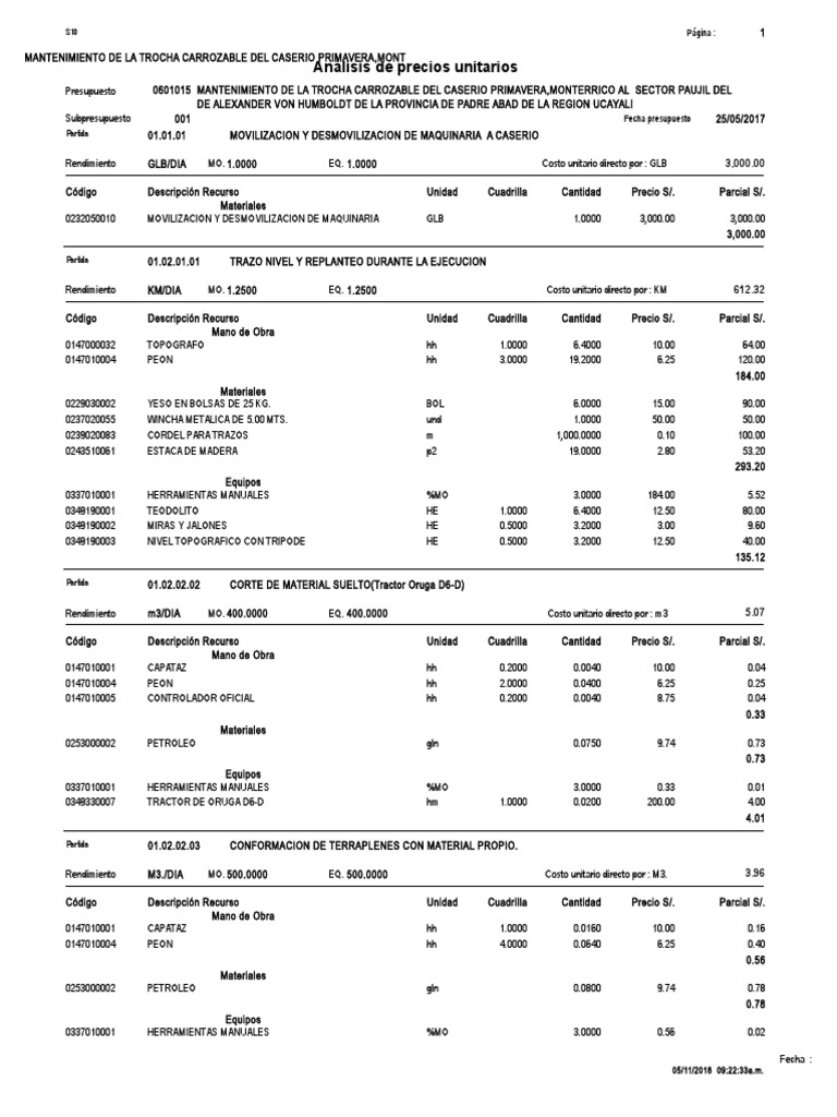 Presupuesto 0601015 MANTENIMIENTO DE LA TROCHA CARROZABLE DEL CASERIO PRIMAVERA,MONTERRICO AL SECTOR PAUJIL DEL