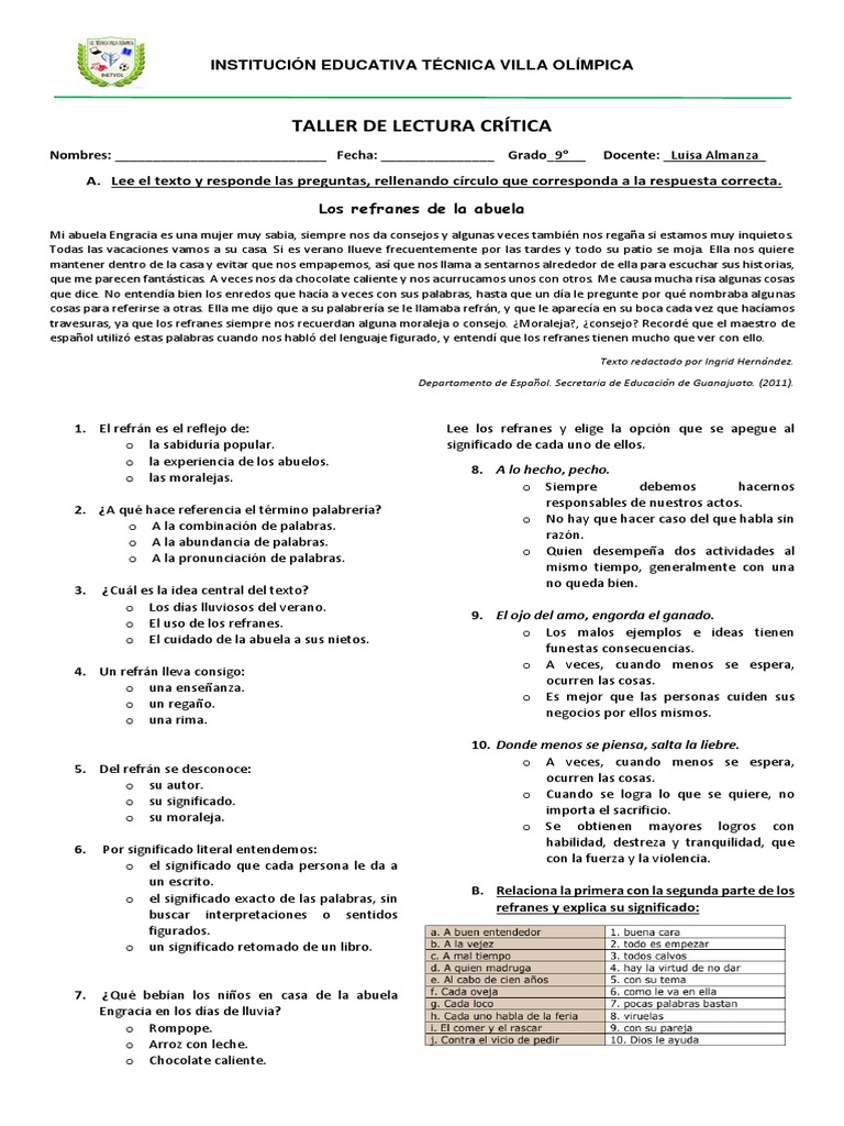 1. El refrán es el reflejo de: Lee los refranes y elige la opción que se apegue al