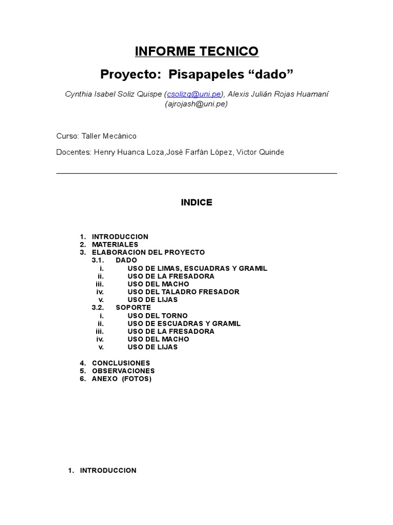 En el presente informe del proyecto aplicativo “pisapapeles dado” les comentare mis