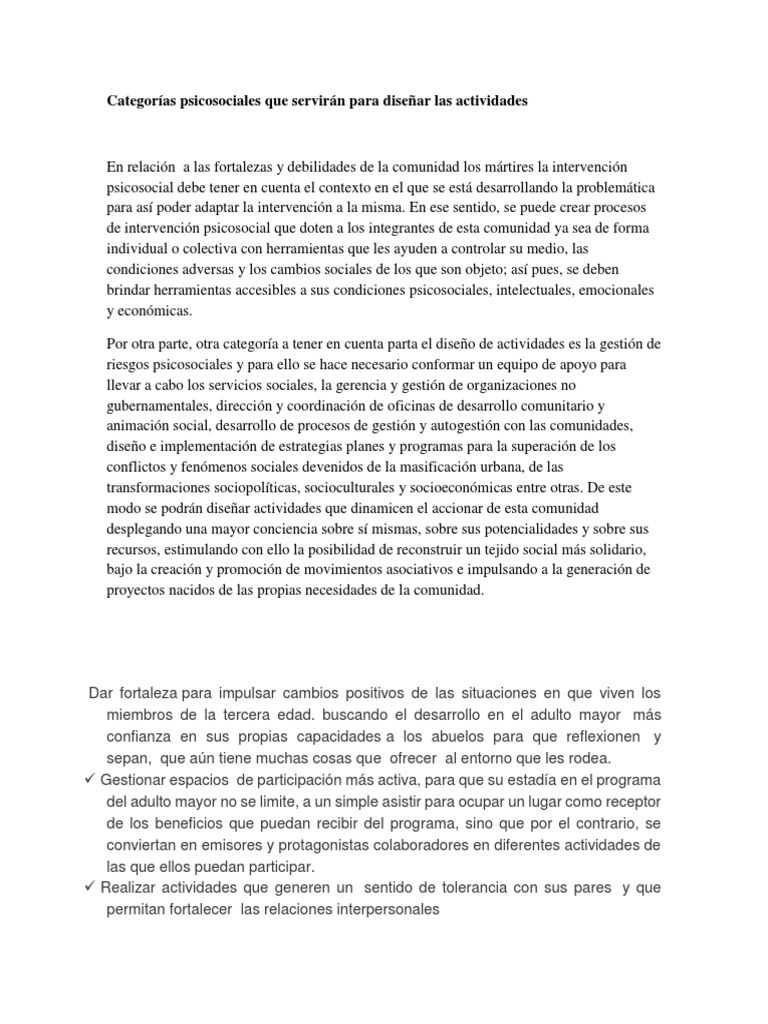 Categorías psicosociales que servirán para diseñar las actividades
