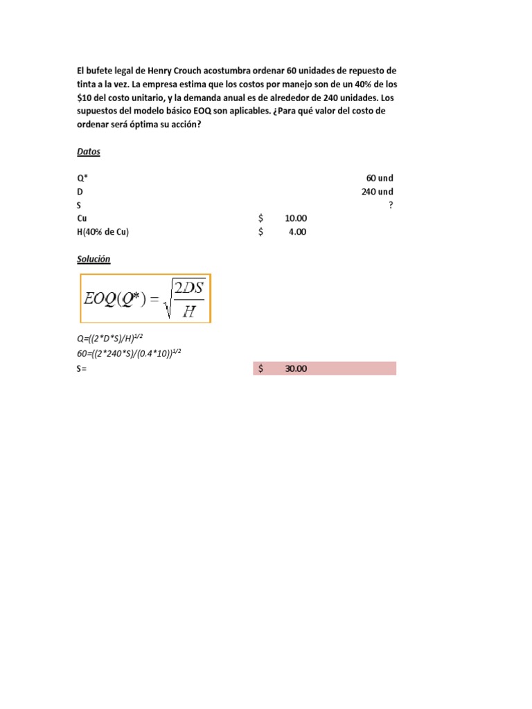 supuestos del modelo básico EOQ son aplicables. ¿Para qué valor del costo de