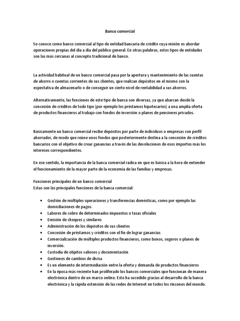 Se conoce como banco comercial al tipo de entidad bancaria de crédito cuya misión es abordar