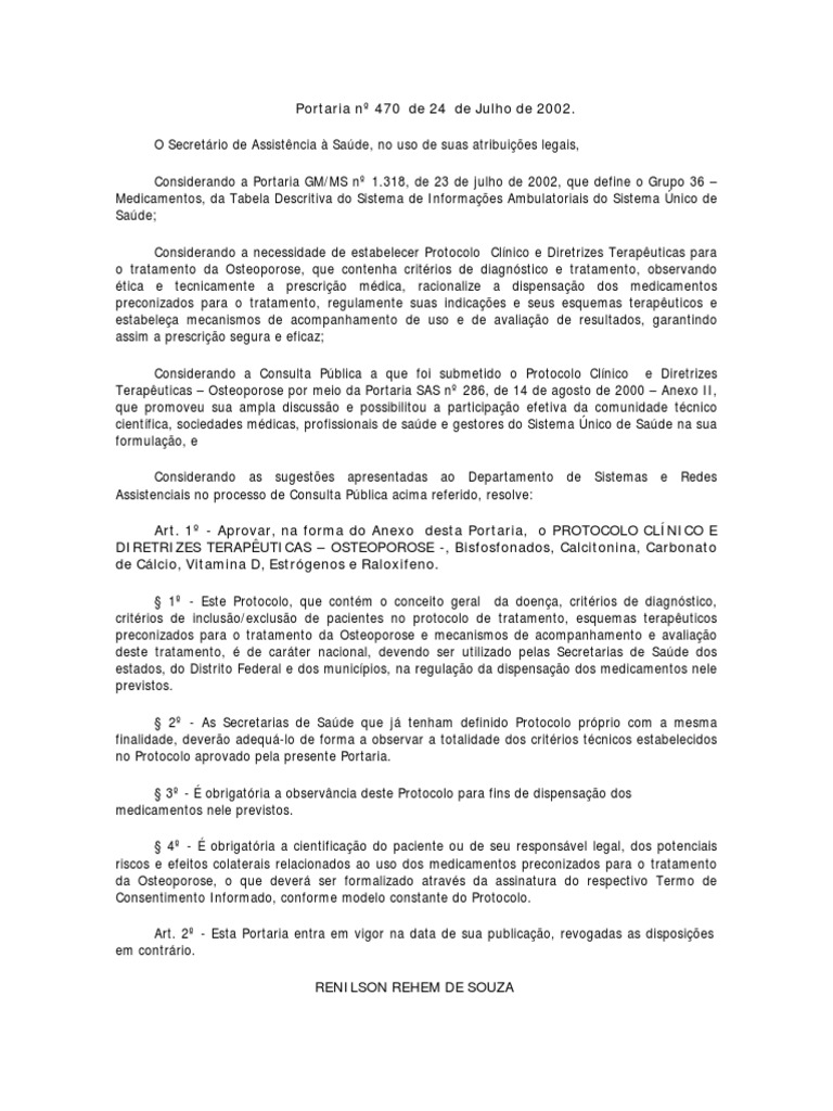 critérios de inclusão/exclusão de pacientes no protocolo de tratamento, esquemas terapêuticos preconizados para o tratamento da Osteoporose e mecanismos de acompanhamento e avaliação deste tratamento, é de caráter nacional, devendo ser utilizado pelas Secretarias de Saúde dos estados, do Distrito Federal e dos municípios, na regulação da dispensação dos medicamentos nele