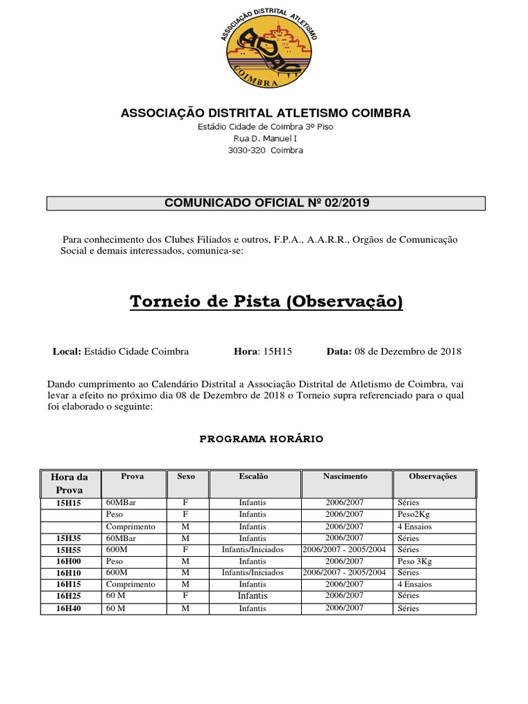 Dando cumprimento ao Calendário Distrital a Associação Distrital de Atletismo de Coimbra, vai