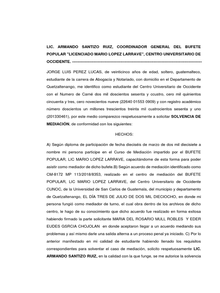 correspondientes para solventar el caso de mediación, solicito respetuosamente LIC.