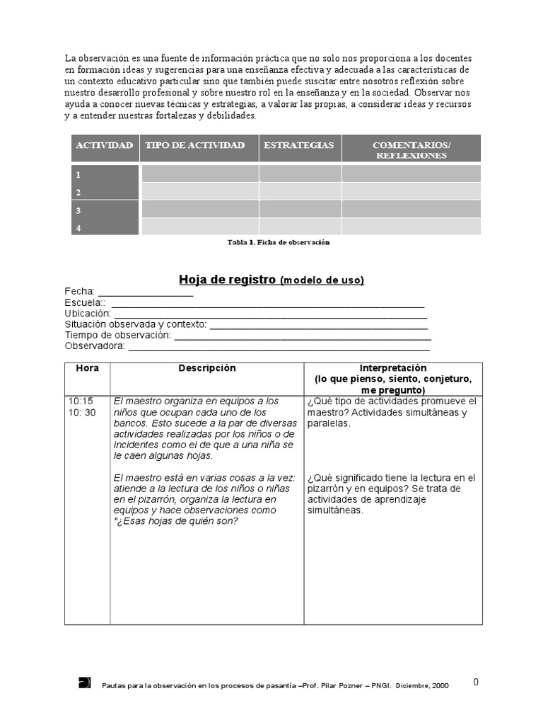 Pautas para la observación en los procesos de pasantía –Prof. Pilar Pozner – PNGI. Diciembre, 2000 0