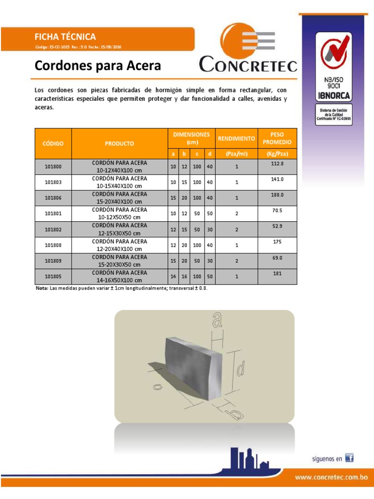 Los cordones son piezas fabricadas de hormigón simple en forma rectangular, con