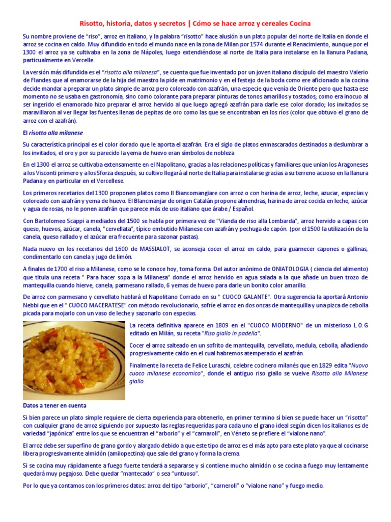 arroz se cocina en caldo. Muy difundido en todo el mundo nace en la zona de Milan por 1574 durante el Renacimiento, aunque por el