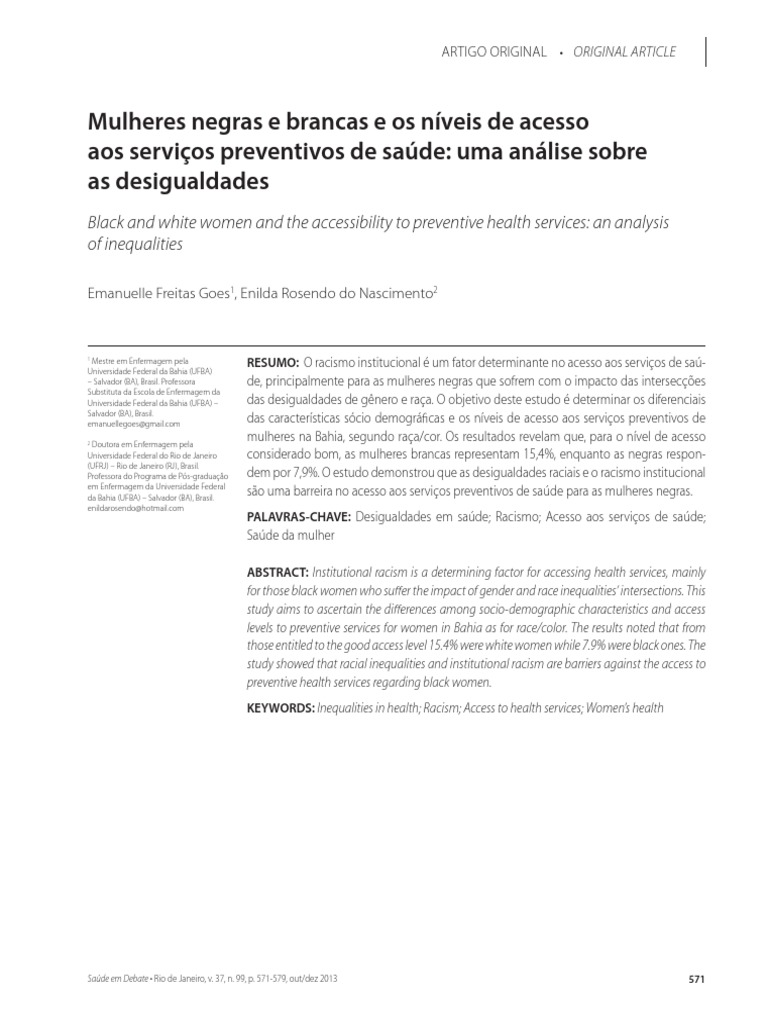 GOES, E. F.; NASCIMENTO, E. R. • Mulheres negras e brancas e os níveis de acesso aos serviços preventivos de saúde: uma análise sobre as desigualdades