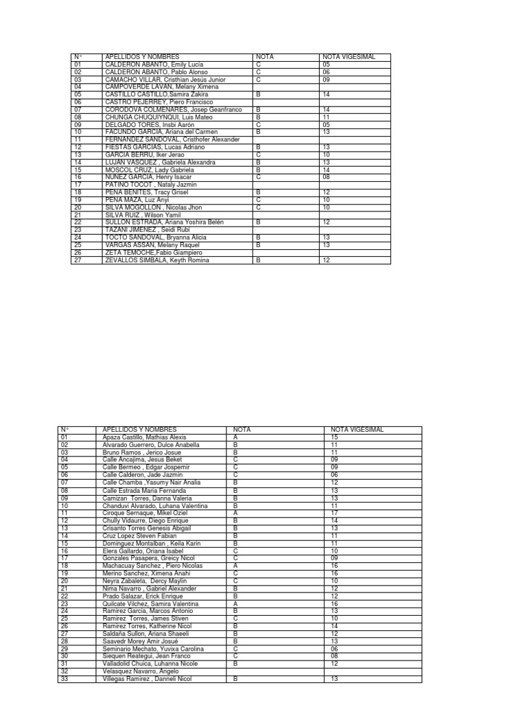 N° APELLIDOS Y NOMBRES NOTA NOTA VIGESIMAL