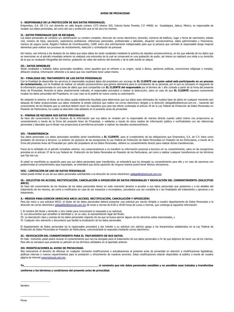 Sus datos personales y/o datos personales sensibles serán transferidos a EL CLIENTE, para el cumplimiento de las obligaciones que Emprexitus, S.A. de C.V. tiene como
