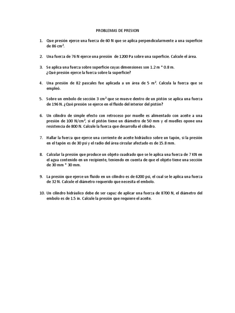 2. Una fuerza de 76 N ejerce una presión de 1200 Pa sobre una superficie. Calcule el área.