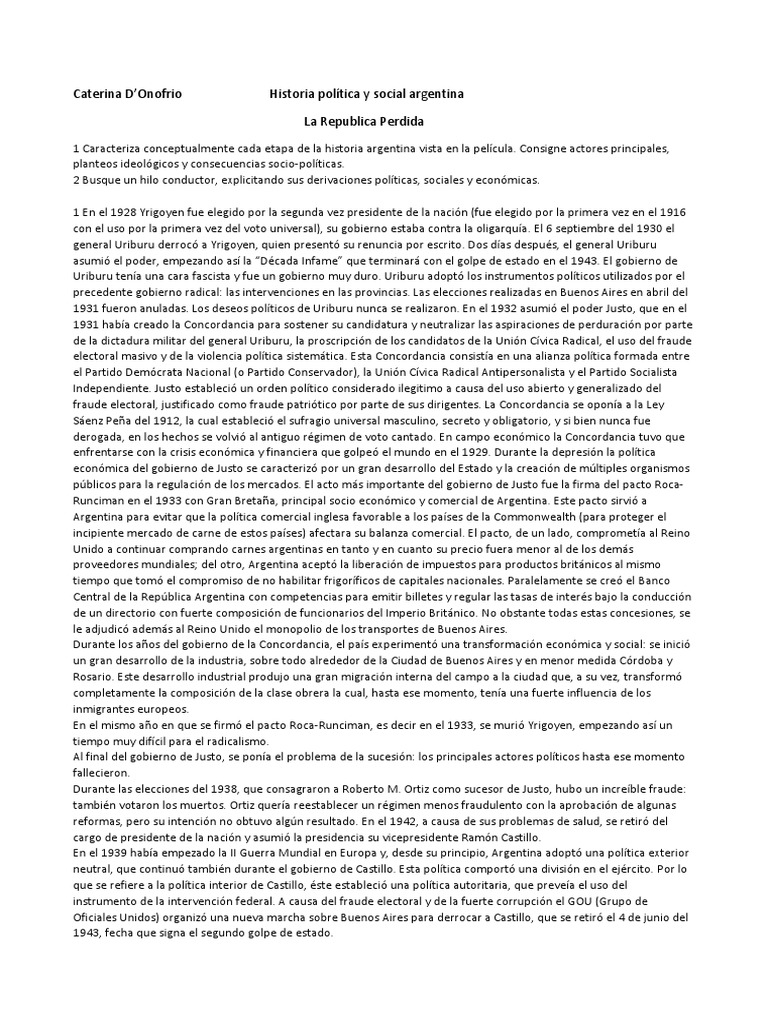 1 Caracteriza conceptualmente cada etapa de la historia argentina vista en la película. Consigne actores principales,