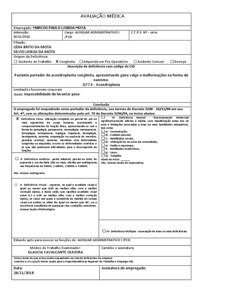 O empregado foi enquadrado como portador da deficiência, nos termos do Decreto 3298 - 20/12/99 em seu