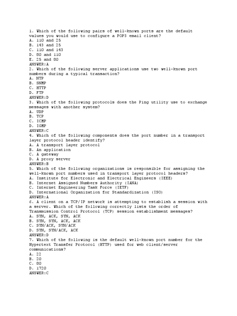 values you would use to configure a POP3 email client? A. 110 and 25 B. 143 and 25 C. 110 and 143 D. 80 and 110 E. 25 and 80 ANSWER:A 2. Which of the following server applications use two well-known port numbers during a typical transaction? A. NTP B. SNMP C. HTTP D. FTP ANSWER:D 3. Which of the following protocols does the Ping utility use to exchange messages with another system? A. UDP B. TCP C. ICMP D. IGMP ANSWER:C 4. Which of the following components does the port number in a transport layer protocol header identify? A. A transport layer protocol B. An application C. A gateway D. A proxy server ANSWER:B 5. Which of the following organizations is responsible for assigning the well-known port numbers used in transport layer protocol headers? A. Institute for Electronic and Electrical Engineers (IEEE) B. Internet Assigned Numbers Authority (IANA) C. Internet Engineering Task Force (IETF) D. International Organization for Standardization (ISO) ANSWER:A 6. A client on a TCP/IP network is attempting to establish a session with a server. Which of the following correctly lists the order of Transmission Control Protocol (TCP) session establishment messages? A. SYN, ACK, SYN, ACK B. SYN, SYN, ACK, ACK C. SYN/ACK, SYN/ACK D. SYN, SYN/ACK, ACK ANSWER:D 7. Which of the following is the default well-known port number for the Hypertext Transfer Protocol (HTTP) used for web client/server communications? A. 22 B. 20 C. 80 D. 1720 ANSWER:C 8. The secured version of the Hypertext Transfer Protocol (HTTPS) uses a different well-known port from the unsecured version. Which of the following ports is used by HTTPS by default? A. 25 B. 80 C. 110 D. 443 ANSWER:D 9. Which of the following Transmission Control Protocol (TCP) control bits is set to 1 to initiate the termination of a session? A. SYN B. URG C. FIN D. END E. PSH ANSWER:C 10. What field in the Transmission Control Protocol (TCP) Option subheader specifies the size of the largest segment a system can receive? A. MSS B. Window C. MMS D. WinMS ANSWER:B 11. What is the term for the combination of an IPv4 address and a port number, as in the following example: 192.168.1.3:23? A. Socket B. OUI C. Well-known port D. Network address E. Domain ANSWER:A 12. Which of the following protocols generate messages that are carried directly within Internet Protocol (IP) datagrams, with no intervening transport layer protocol? (Choose all correct answers.) A. ICMP B. IGMP C. SMTP D. SNMP ANSWER:A 13. Which of the following protocols is used to exchange directory service information? A. RDP B. LDAP C. SNMP D. SMB ANSWER:B 14. Which of the following is the primary application layer protocol used by web browsers to communicate with web servers? A. HTTP B. HTML C. SMTP D. FTP ANSWER:A 15. Which of the following protocols appears on the network as a service that client computers use to resolve names into IP addresses? A. DHCP B. BOOTP C. DNS D. SNMP ANSWER:C 16. Which of the following protocols use(s) the term datagram to describe the data transfer unit it creates? (Choose all correct answers.) A. Ethernet B. IP C. TCP D. UDP ANSWER:C AND D 17. What is the native file sharing protocol used on all Microsoft Windows operating systems? A. Hypertext Transfer Protocol (HTTP) B. Network File System (NFS) C. File Transfer Protocol (FTP) D. Server Message Block (SMB) E. Lightweight Directory Access Protocol (LDAP) ANSWER:B 18. When analyzing captured TCP/IP packets, which of the following control bits must you look for in the Transmission Control Protocol (TCP) header to determine whether the receiving host has successfully received the sending host’s data? A. ACK B. FIN C. PSH D. SYN E. URG ANSWER:A 19. Which of the following terms describes the Transmission Control Protocol (TCP) exchange that establishes a connection prior to the transmission of any data? A. Synchronization B. Initialization exchange C. Connection establishment D. Three-way handshake ANSWER:D 20. Alice has been instructed to install 100 Windows workstations, and she is working on automating the process by configuring the workstations to use PXE boots. Each workstation therefore must obtain an IP address from a DHCP server and download a boot image file from a TFTP server. Which of the following well-known ports must Alice open on the firewall separating the workstations from the servers? (Choose all correct answers.) A. 65 B. 66 C. 67 D. 68 E. 69 ANSWER:C D E 21. Which of the following explanations best describes the function of a Transmission Control Protocol (TCP) or User Datagram Protocol (UDP) port number? A. The port number indicates to the receiver that the sender can activate a specific port only. B. The port number is used by both the sender and the receiver to identify the application that generated the information in the datagram. C. The port number is used only by the receiver to indicate the application process running on the sender. D. The port number is used by both the sender and the receiver to negotiate a well-known server port for the communicating processes. ANSWER:B 22. What is the valid range of numbers for the ephemeral client ports used by the Transmission Control Protocol (TCP) and User Datagram Protocol (UDP)? A. 1023 through 65534 B. 1 through 1024 C. 49152 through 65535 D. 1024 to 49151 ANSWER:D 23. Which of the following statements about the User Datagram Protocol (UDP) are true? (Choose all correct answers.) A. UDP does not use packet sequencing and acknowledgments. B. UDP uses packet sequencing and acknowledgments. C. UDP is a connection-oriented protocol. D. UDP is a connectionless protocol. E. UDP has an 8-byte header. F. UDP has a 20-byte header. ANSWER:D E 24. Which of the following port values are used by the File Transfer Protocol (FTP)? (Choose all correct answers.) A. 21 B. 23 C. 20 D. 53 E. 69 ANSWER:A C 25. Which of the following protocols provides connectionless delivery service at the transport layer of the Open Systems Interconnection (OSI) model? A. TCP B. HTTP C