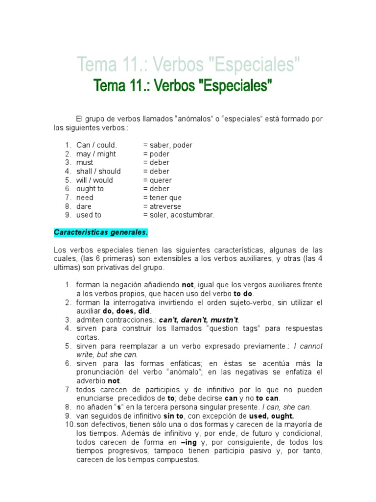 El documento describe los verbos anómalos o especiales en inglés, los cuales incluyen can, could, may, must, shall, should, will, would, ought to, need, dare y used to. Estos verbos tienen características únicas como la formación de la negación con "not", la inversión del sujeto-verbo en interrogativas, y carecen de infinitivo o participio. Además, se usan para expresar habilidad, posibilidad, permiso, obligación y otros matices modales.