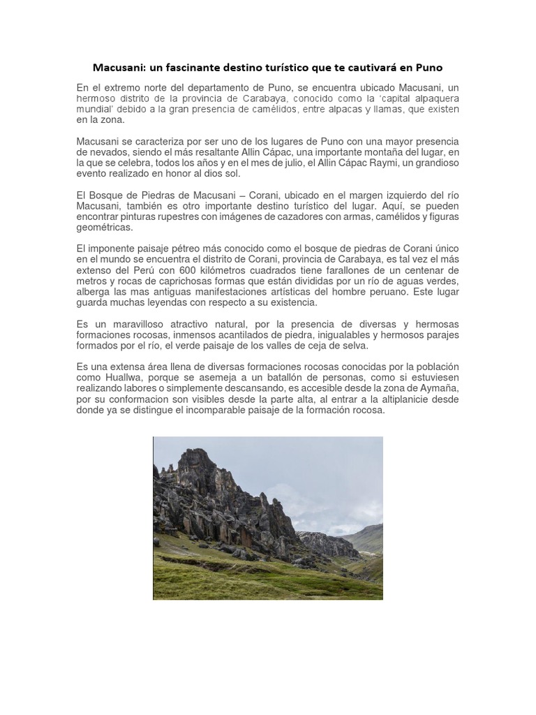 En el extremo norte del departamento de Puno, se encuentra ubicado Macusani, un