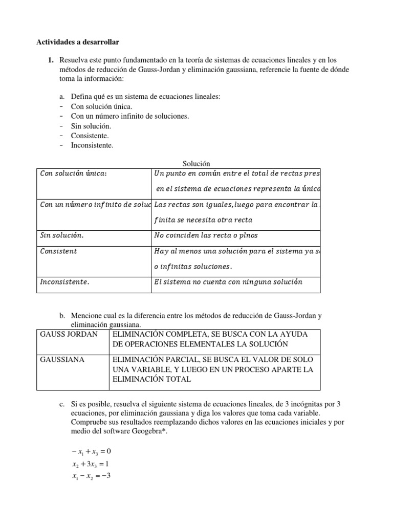 1. Resuelva este punto fundamentado en la teoría de sistemas de ecuaciones lineales y en los
