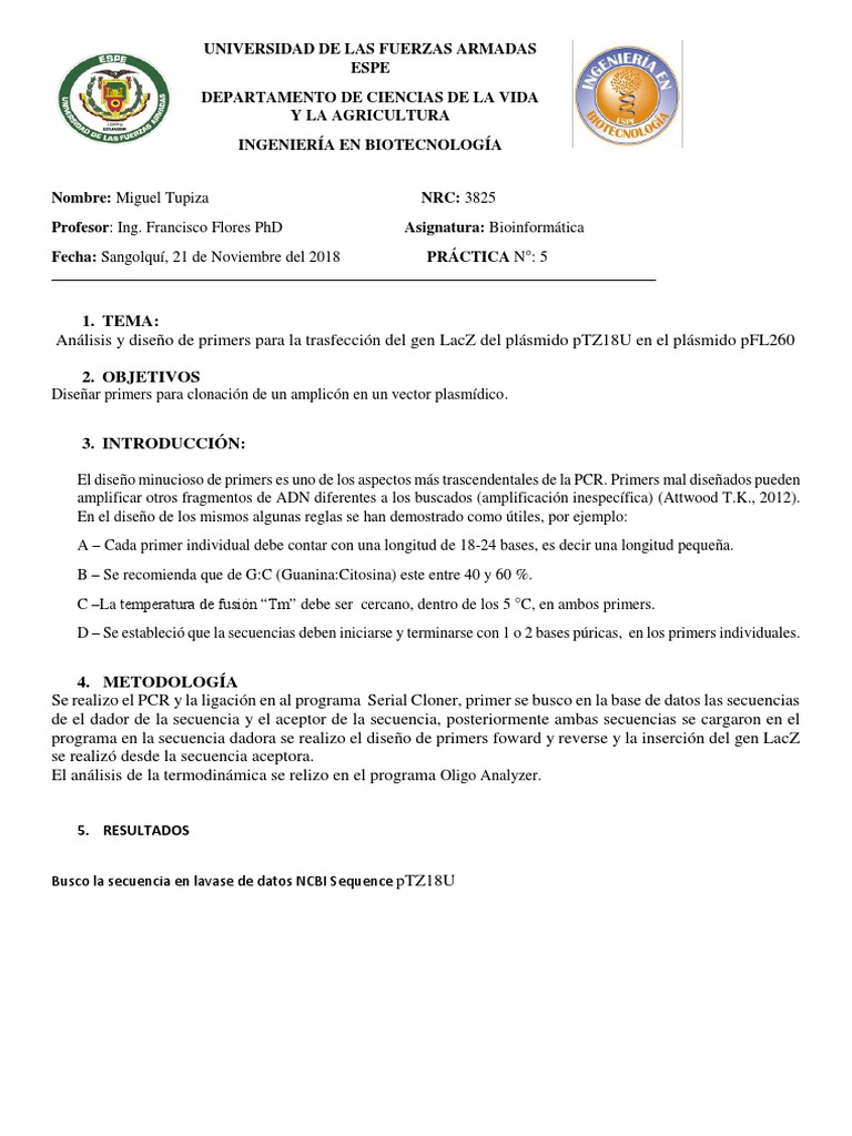 Análisis y diseño de primers para la trasfección del gen LacZ del plásmido pTZ18U en el plásmido pFL260