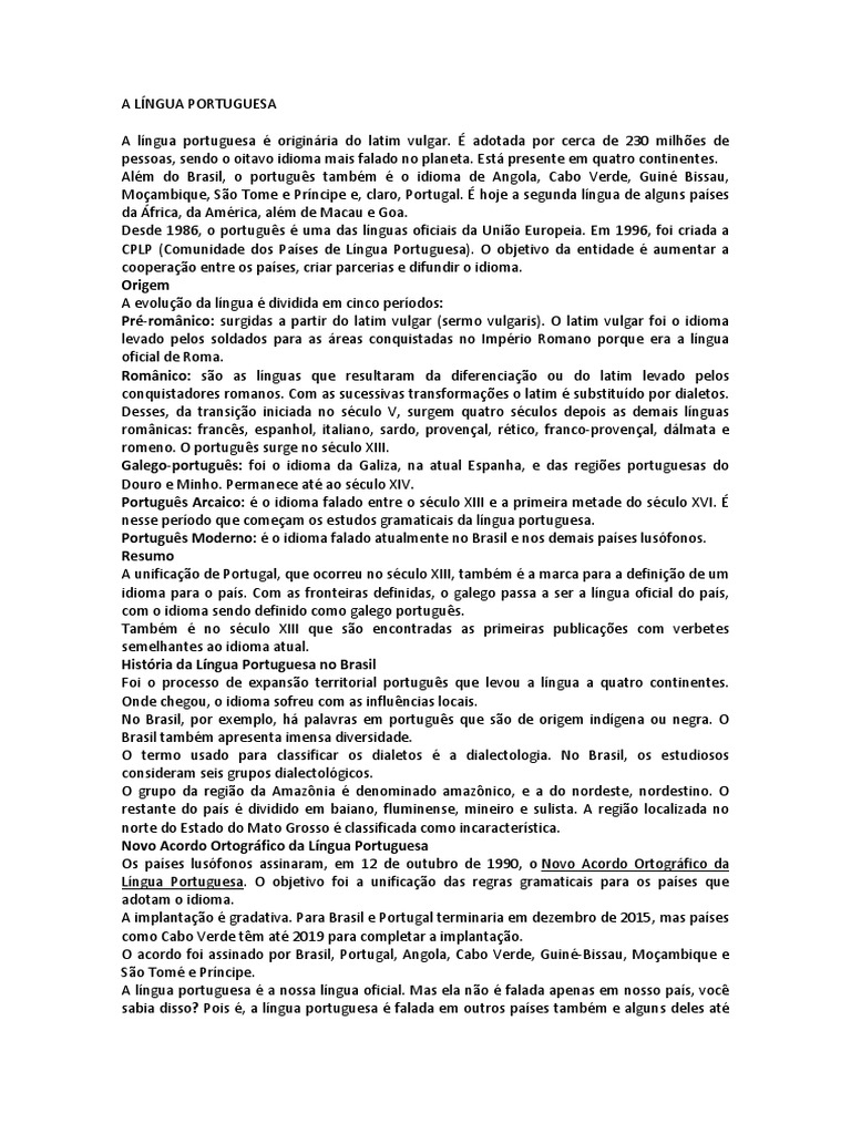 A língua portuguesa é originária do latim vulgar. É adotada por cerca de 230 milhões de