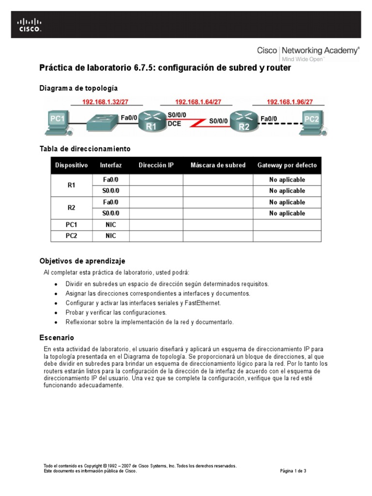 Aspectos básicos de redes: Direccionamiento de la red: IPv4 Práctica de laboratorio 6.7.5: Configuración de subred y router