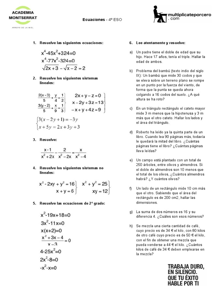 Este documento presenta varios problemas de ecuaciones de diferentes tipos que deben resolverse. Incluye ecuaciones de primer grado, sistemas de ecuaciones lineales y no lineales, ecuaciones de segundo grado, y problemas de la vida real que implican ecuaciones para hallar cantidades desconocidas.