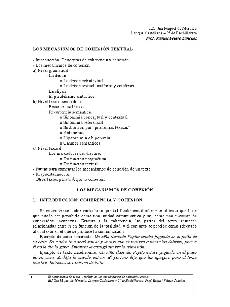 - Pautas para comentar los mecanismos de cohesión de un texto.
