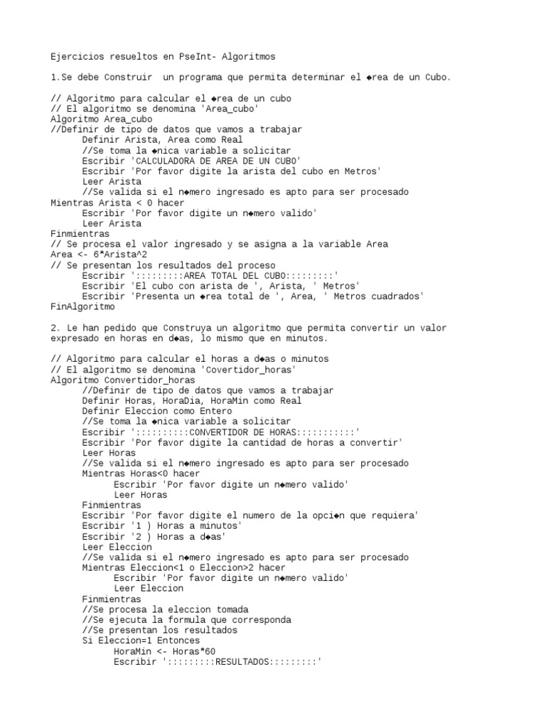 Este documento presenta dos algoritmos. El primero calcula el área de un cubo a partir de la longitud de su arista. El segundo convierte un valor de horas a días o minutos dependiendo de la opción seleccionada por el usuario. Ambos algoritmos utilizan variables, estructuras de control y presentan los resultados de manera clara.