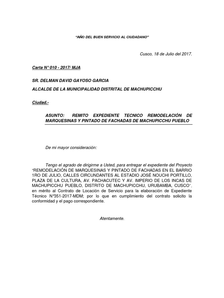 Técnico N°351-2017-MDM; por lo que en cumplimiento del contrato solicito la
