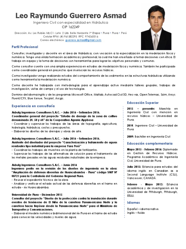Dominio del idioma inglés y de los programas Microsoft Office, Matlab, Autocad Civil 3D, Hec-ras, Open Telemac, Ssiim, Ansys