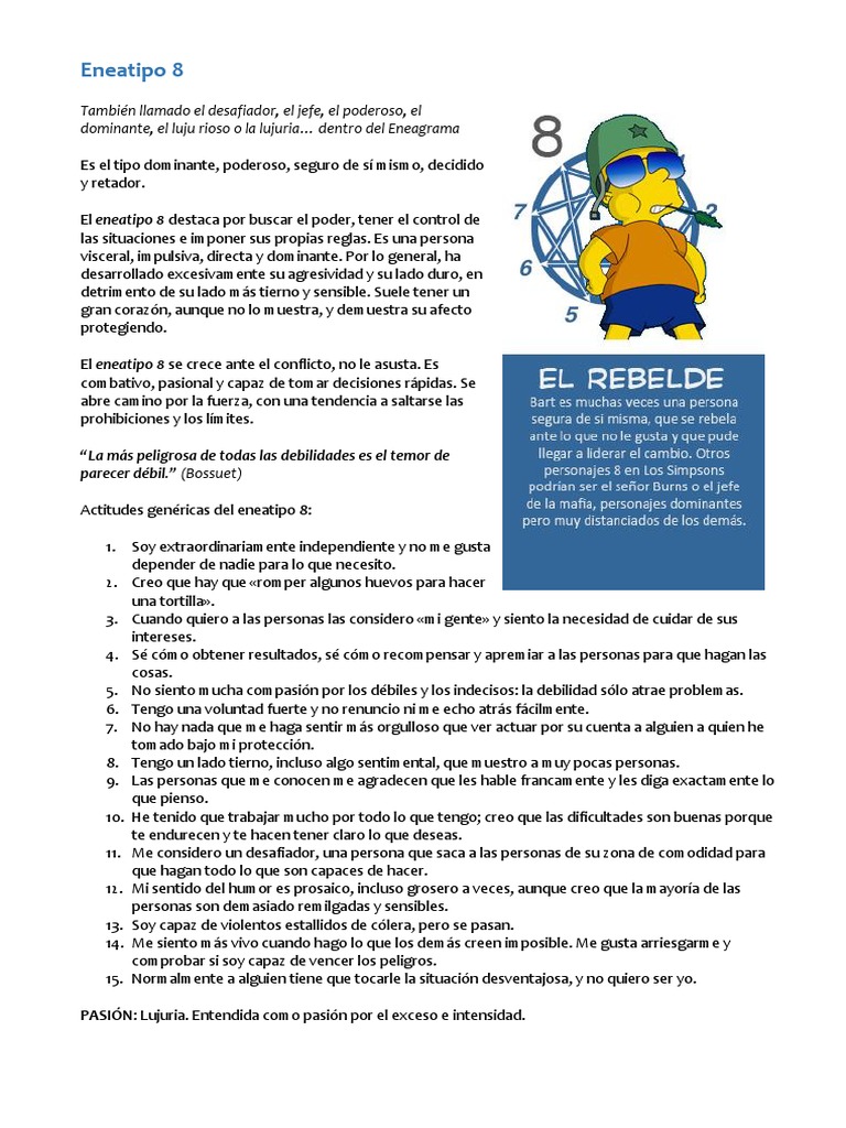 Promedio (lo más habitual). Al eneatipo 8 promedio le preocupa llegar a ser autosuficiente así como