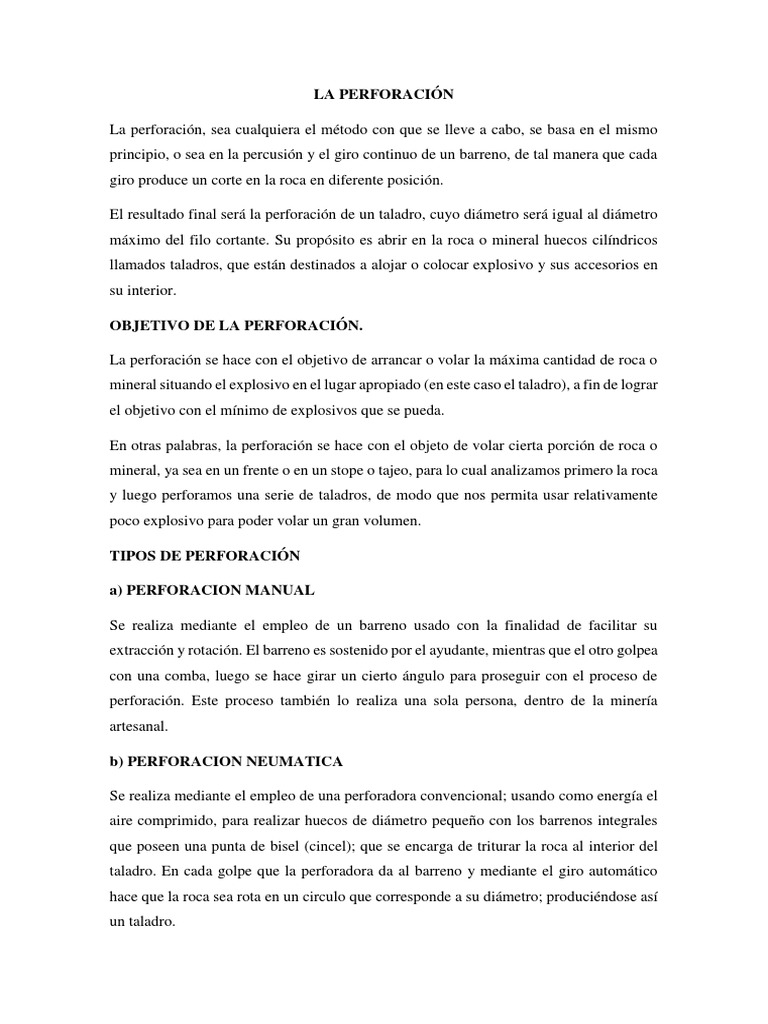 perforación. Este proceso también lo realiza una sola persona, dentro de la minería