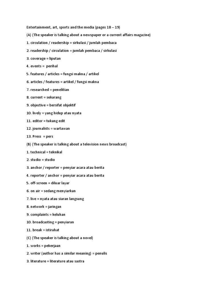 Entertainment, art, sports and the media (pages 18 – 19)