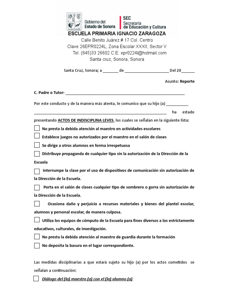 indisciplina y las consecuencias del mismo y enterar por escrito al padre de familia o tutor