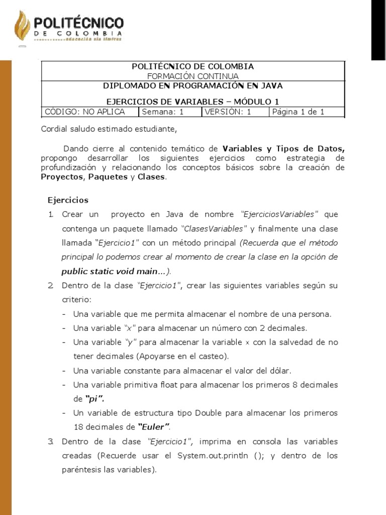 1. Crear un proyecto en Java de nombre “EjerciciosVariables” que