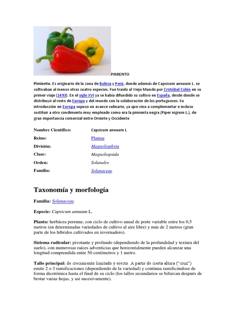 Pimiento. Es originario de la zona de Bolivia y Perú, donde además de Capsicum annuum L. se